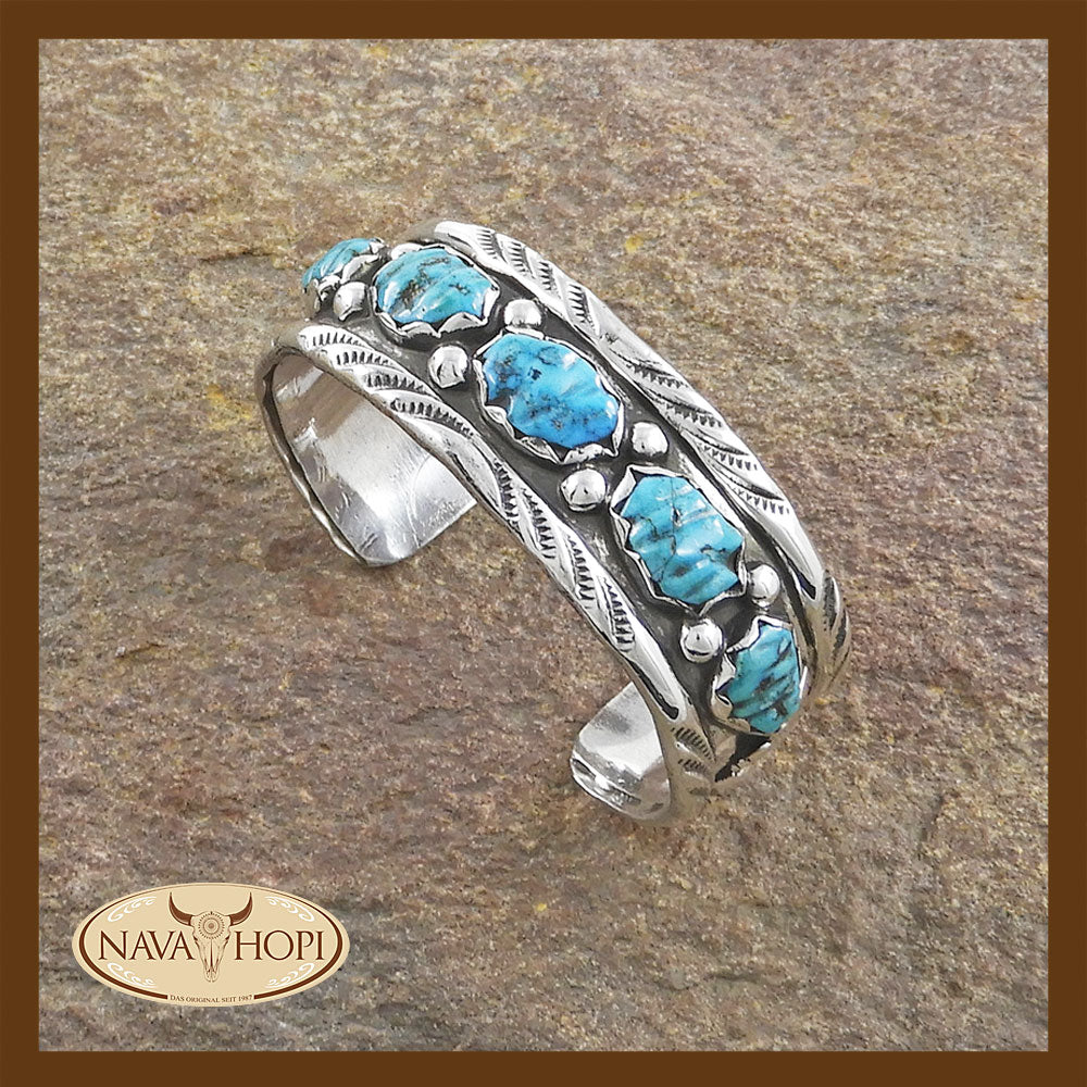 Navajo Damenarmreif, Sterling Silber mit fünf echten Türkis Steinen, Stempelung Wayne C., Breite ca. 22mm, Durchmesser ca. 58mm, Gesamtumfang ca. 16cm
