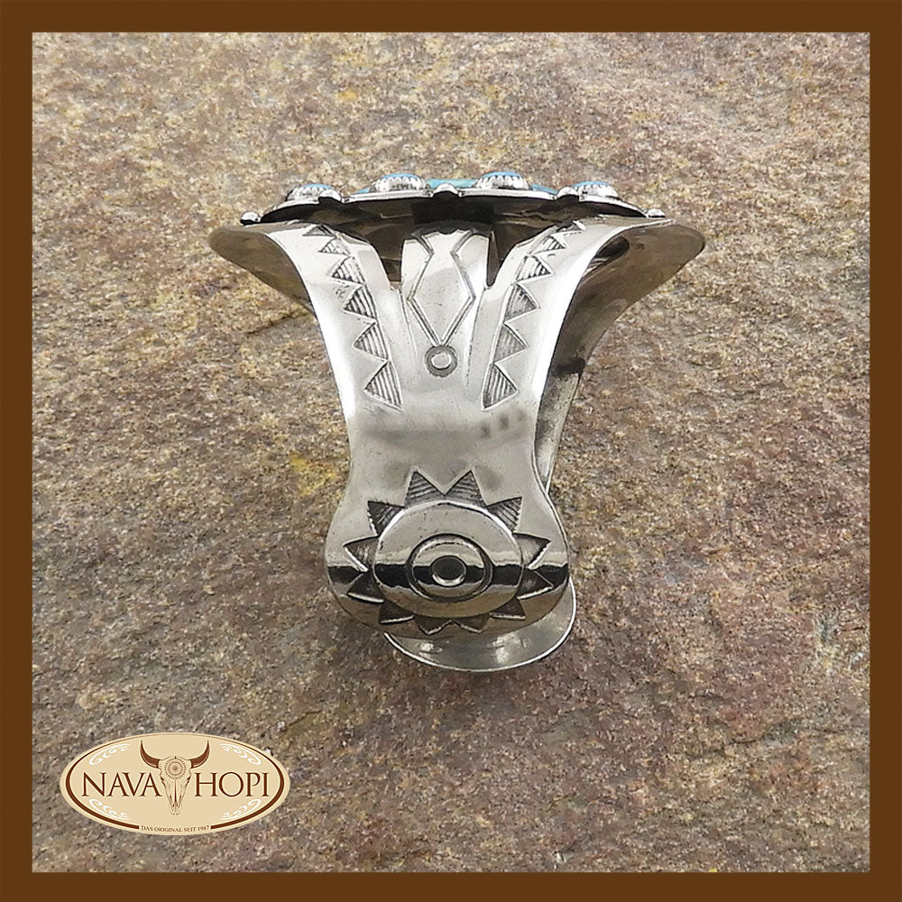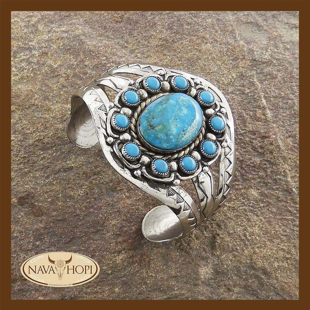 Antiker Navajo Damenarmreif ( ca. 1940 ) mit einem großen und zehn kleinen echten Türkis Steinen, Breite ca. 52m, Durchmesser ca. 60mm, Gesamtumfang ca. 16cm