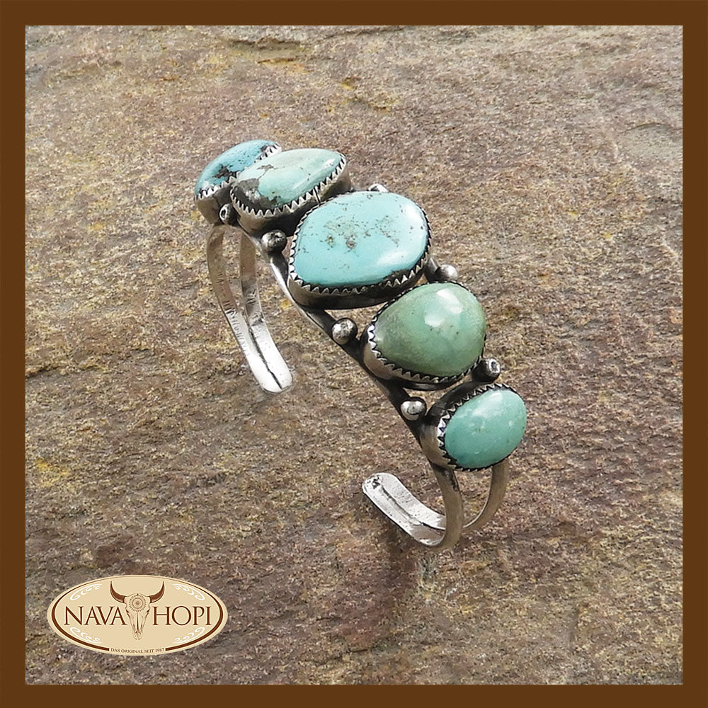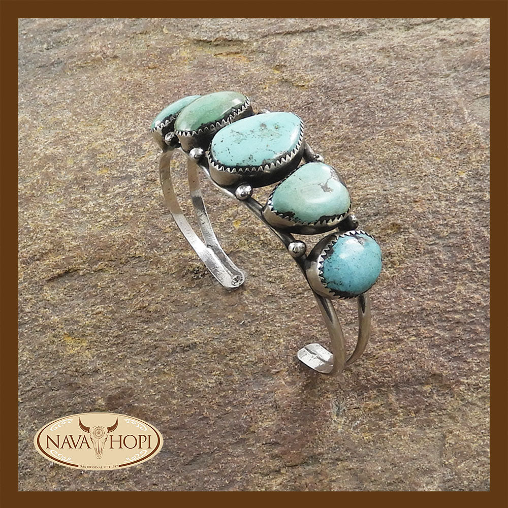 Navajo Damenarmreif, Sterling Silber mit fünf verschiedenen Türkis Steinen, Breite ca. 22mm, Durchmesser ca. 60mm, Gesamtumfang ca. 16,5cm