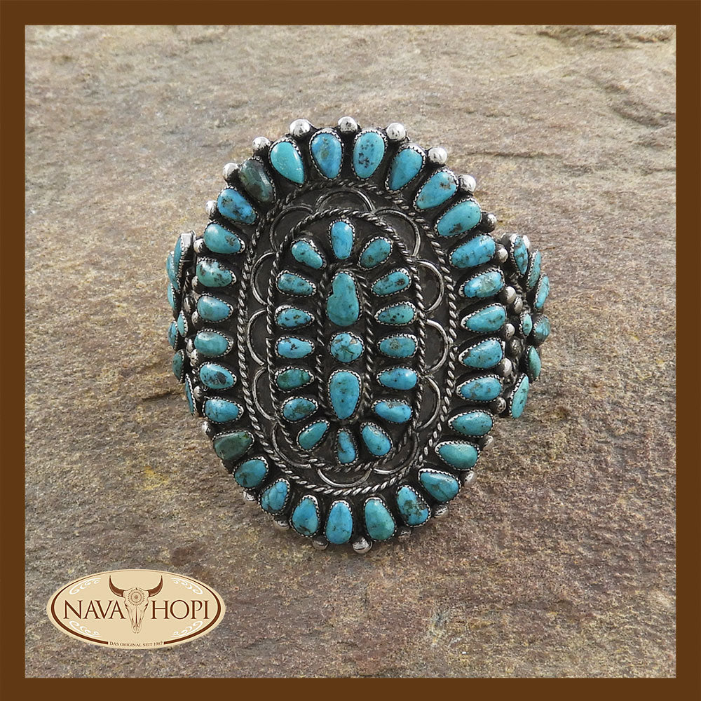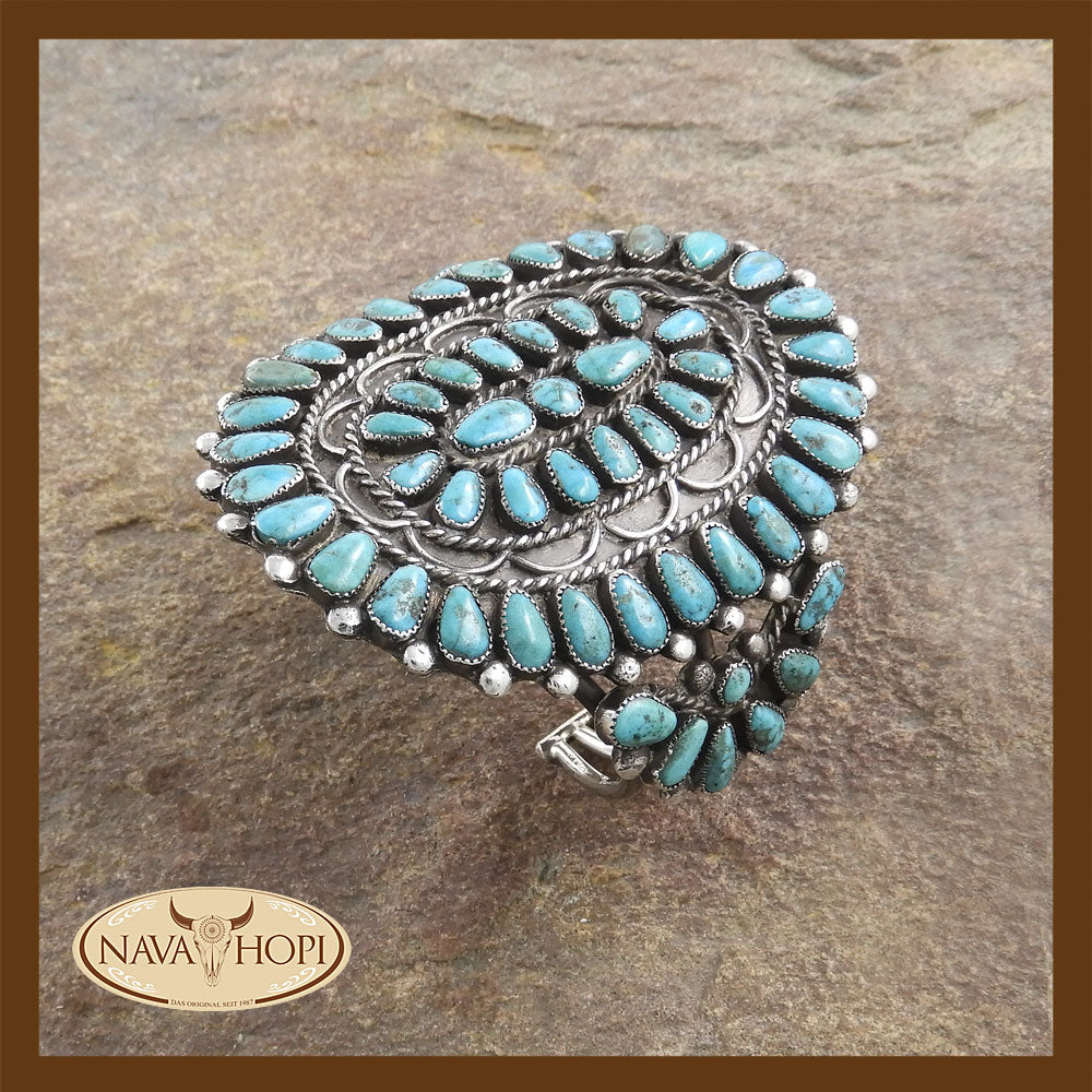 Navajo Damenarmreif Türkis, Sterling Silber mit 62 verschiedenen echten Türkissteinen, Breite ca. 79mm, Durchmesser ca. 57mm, Gesamumfang ca.15.5cm