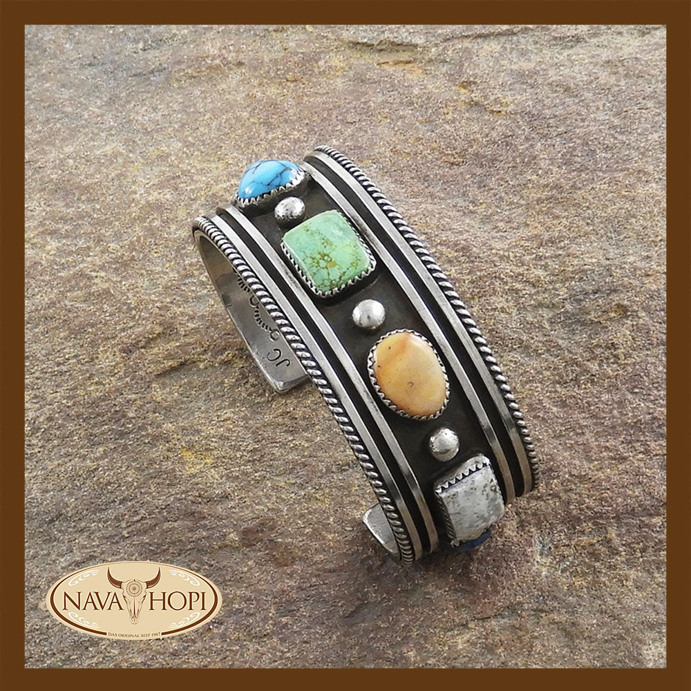 Navajo Herrenarmreif Multicolor, Sterling Silber mit sieben verschiedenen Stein, Stempelung JC, Breite ca. 25,5mm, Durchmesser ca. 65mm, Gesamtumfang ca. 17.5cm