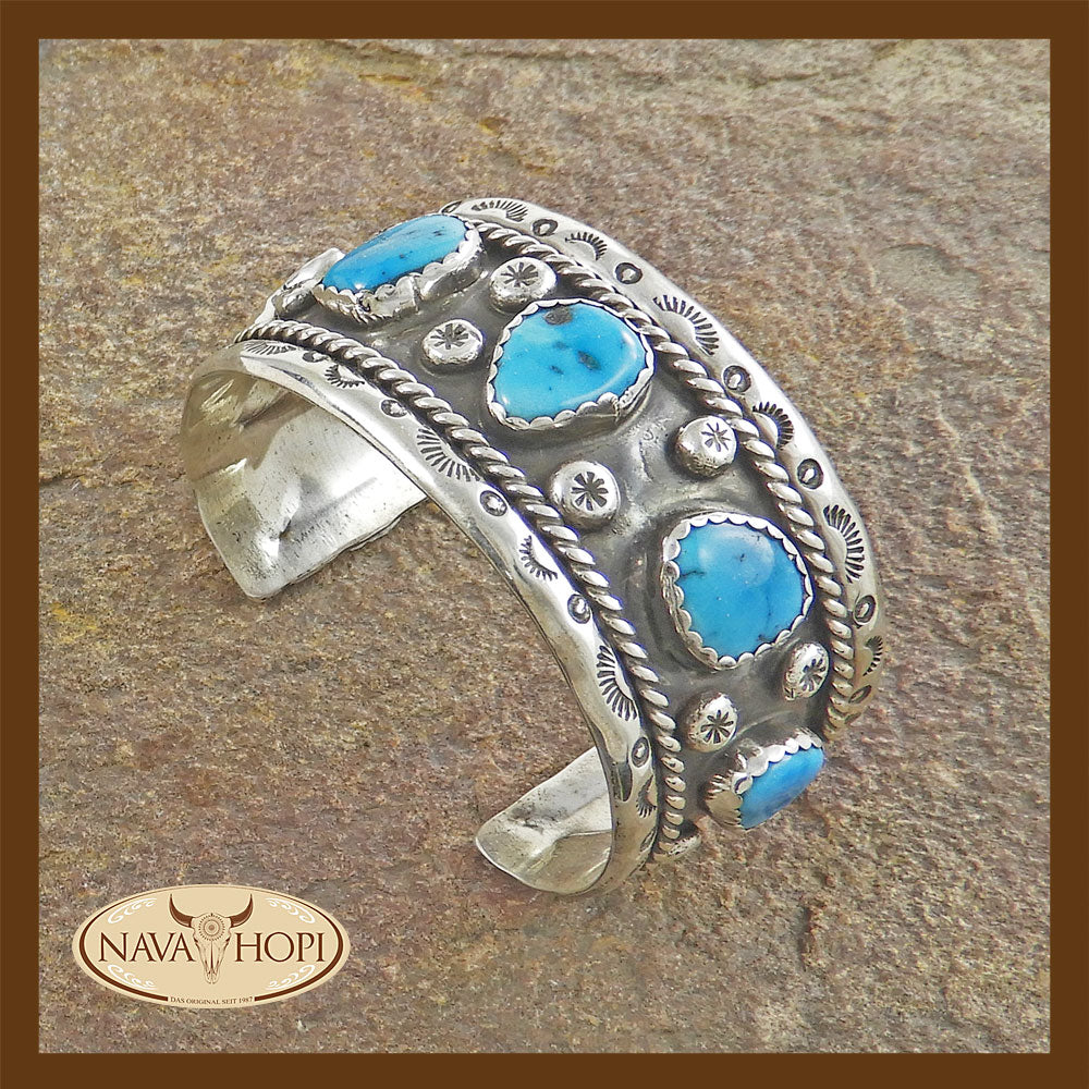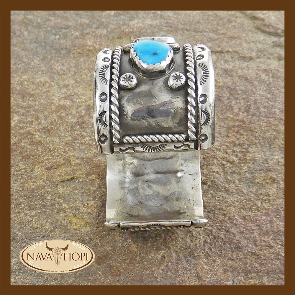 Navajo Herrenarmreif Türkis, Sterling Silber mit fünf echten Türkis Steinen, Stempelung RV, Breite ca. 35mm, Durchmesser ca. 69mm, Gesamtumfang ca. 18mm