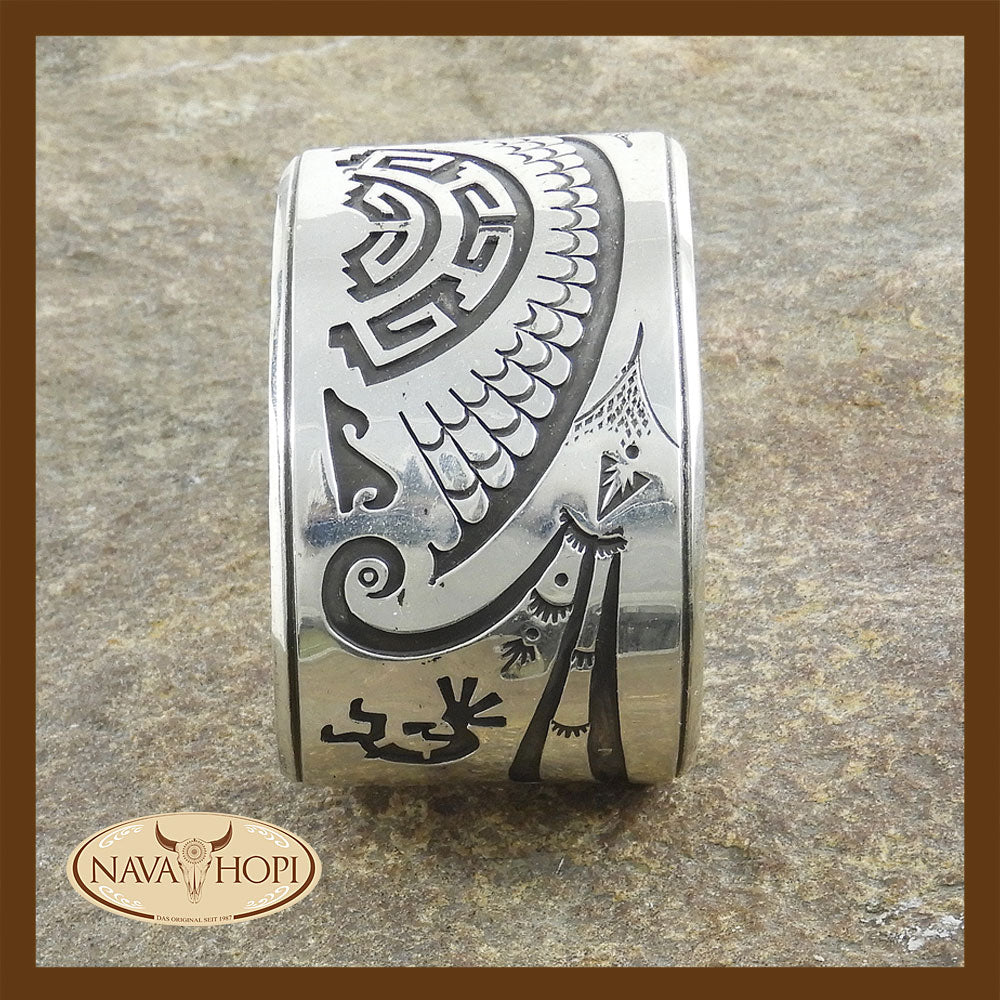 Navajo Damenarmreif mit Kokopelli und indianischen Symbolen, Sterling Silber, Breite ca. 38mm, Durchmesser ca. 62mm, Gesamtumfang ca. 18cm