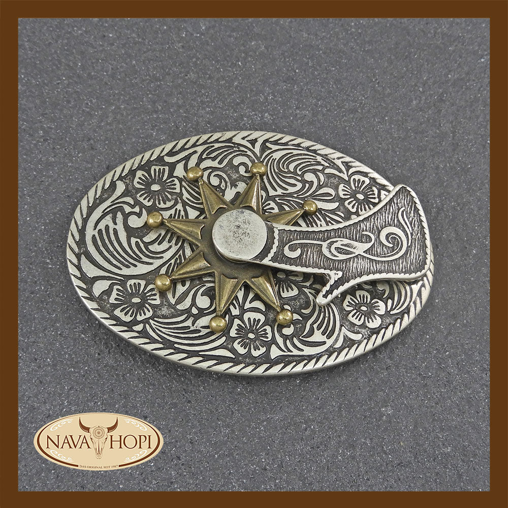 Gürtelschnalle mit drehbarer goldfarbenen Spore, Aluminiumguss, Größe ca 9x6,3 cm, Gürtelaufnahme 4cm