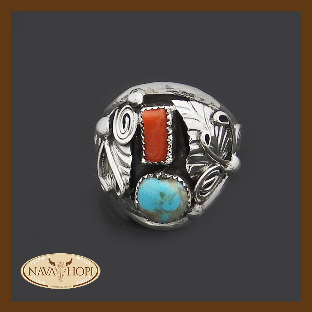 Navajo Herrenring, Sterling SIlber mit echtem Türkis Stein und Koralle, Stempelung B, Breite ca. 26mm