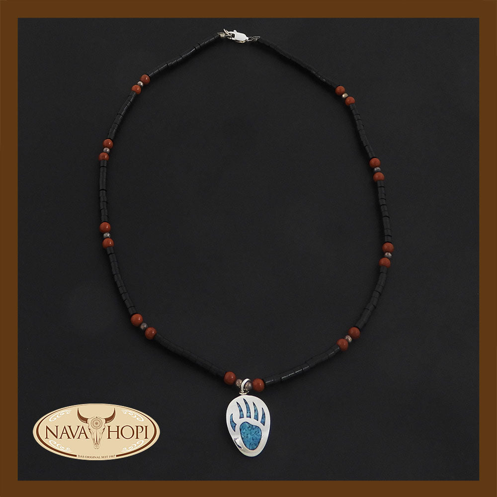 Kette Bärentatze, mit schwarzen Röhrchen, roten Kugeln und Silberkügelchen, Anhänger Sterling Silber mit Türkis Chipinlay , Verschluss Sterling Silber, Kettenlänge ca. 42 cm