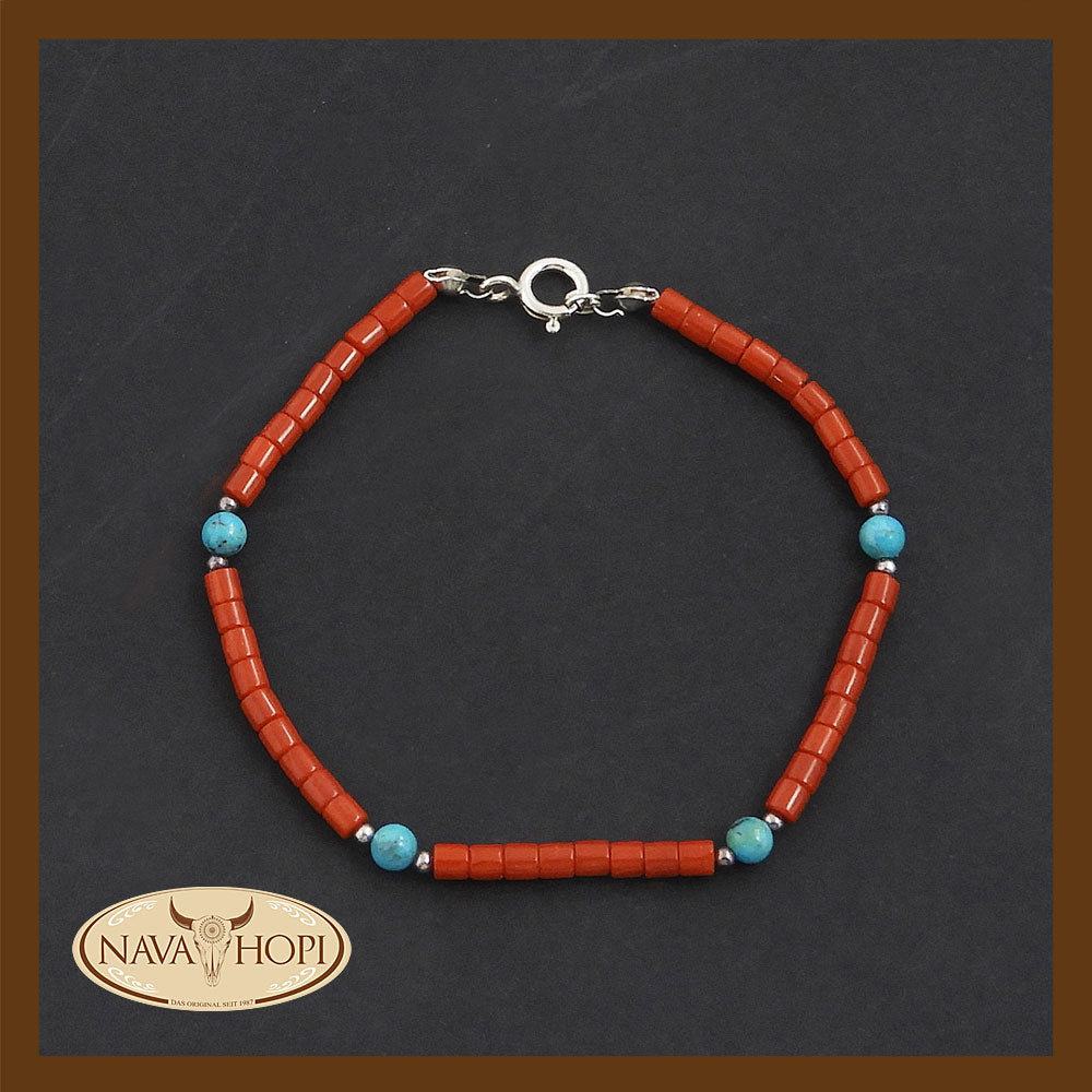 Armband aus roten Röhrchen und Türkis Kugeln mit Sterling Silber Kugeln, Länge ca. 18cm