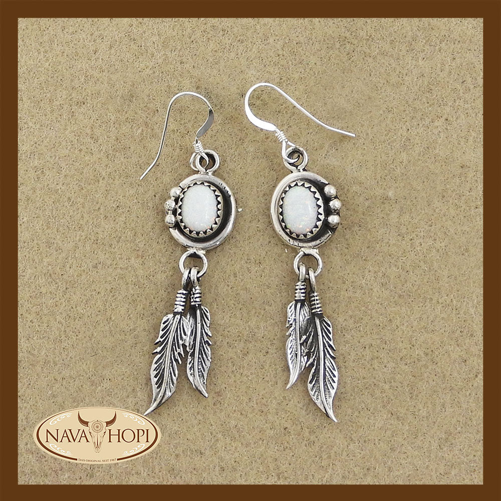 Navajo Ohrhänger mit zwei Federn von Navajo Künstlerin Rita Largo, Sterling Silber mit synthetischem Opal, Länge incl. Hänger ca. 52mm, Breite ca. 11mm