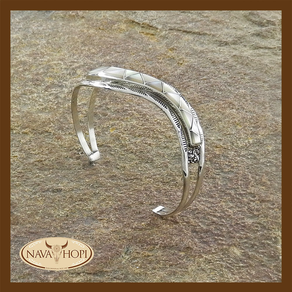 Elegant geformter Zuni Damenarmreif, Sterling Silber mit Perlmutt, Stempelung EC, Breite ca. 14mm, Durchmesser ca. 57mm, Gesamtumfang ca. 16cm