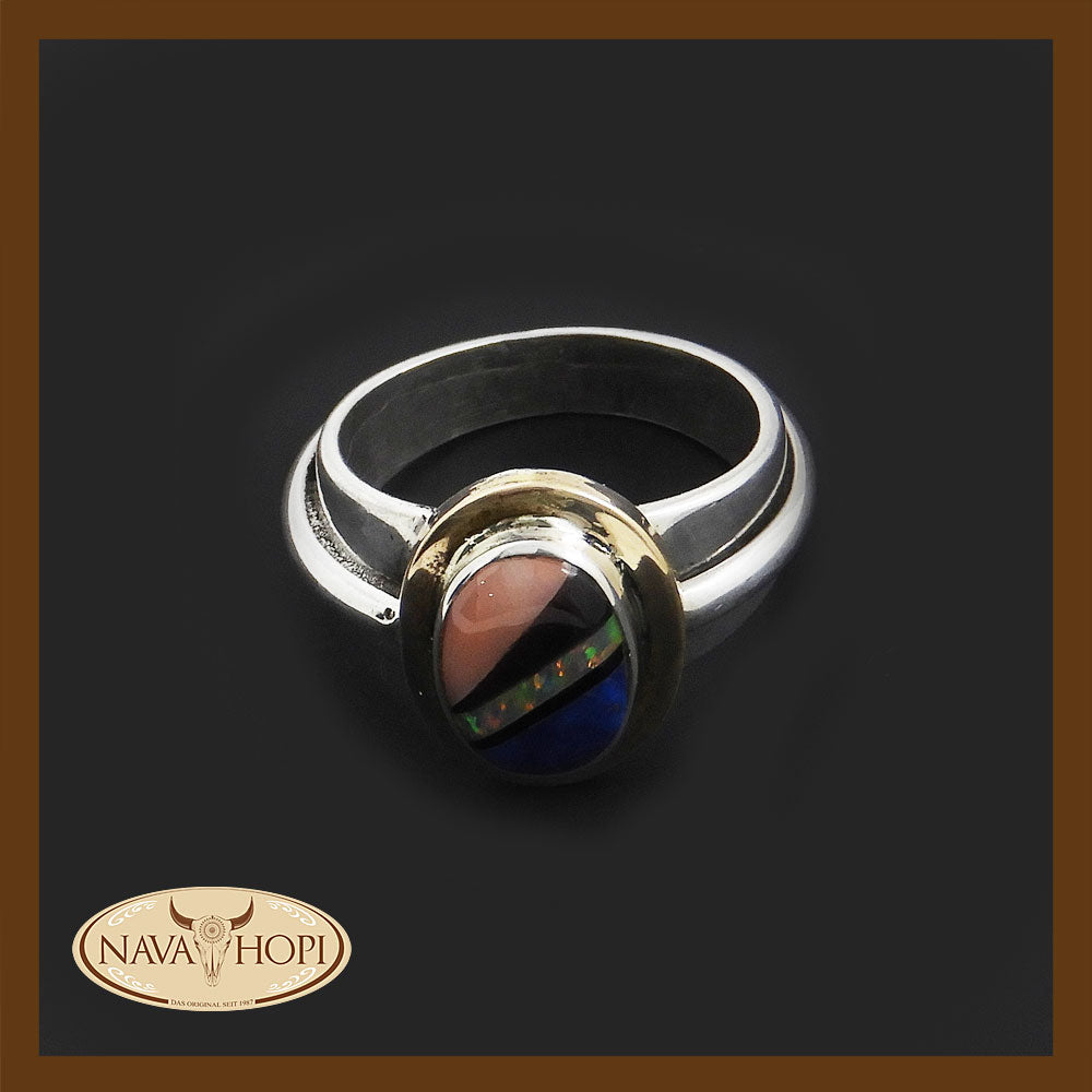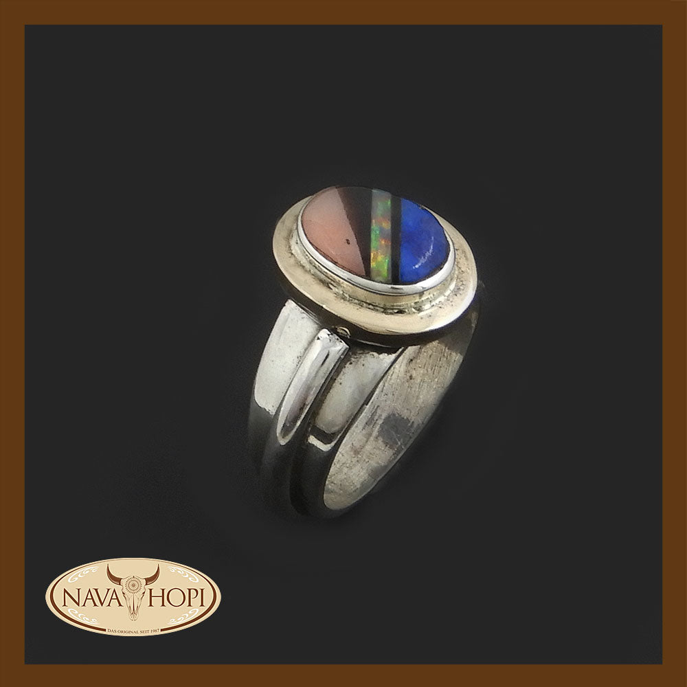 Zuni Damenring, Sterling Silber mit Koralle, Muschel und synthetischem Opal, 333er Goldauflage, Breite ca. 16mm